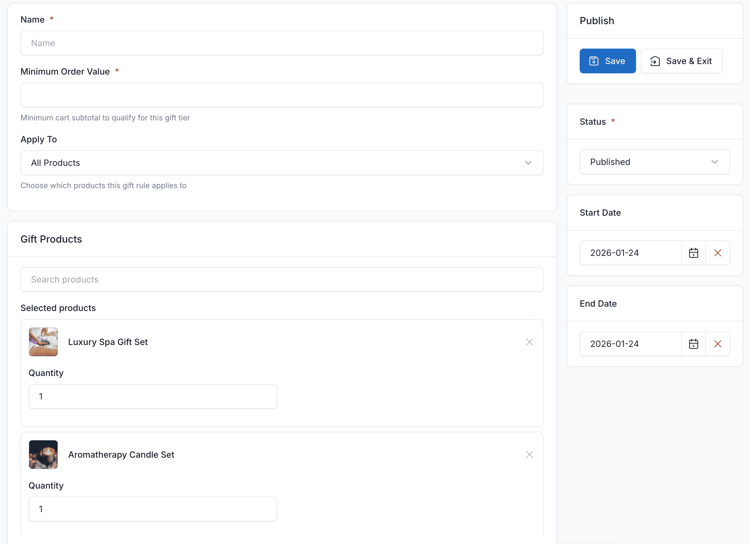 Schedule gift promotions with start and end dates for time-limited campaigns.